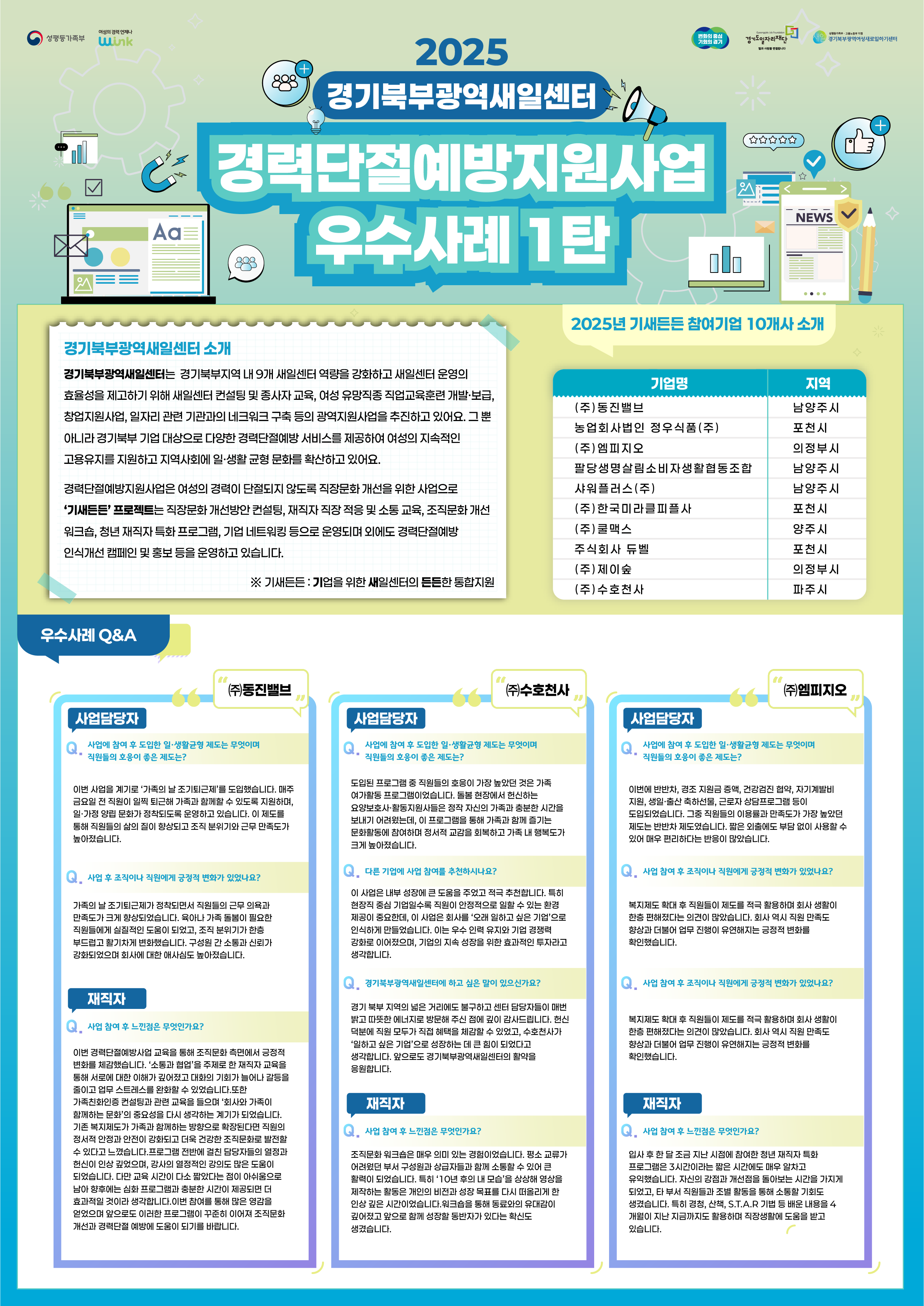 ‘기새든든’ 사업은 출산·육아·돌봄 등의 사유로 경력이 단절될 위험에 놓인 근로자들이 안정적으로 일자리를 유지하고, 조직 내에서 지속적으로 성장할 수 있도록 지원하는 사업이다. 이번 우수사례 선정은 현장에서 실질적인 변화를 만들어낸 기업을 발굴·확산하기 위해 진행되었다.
