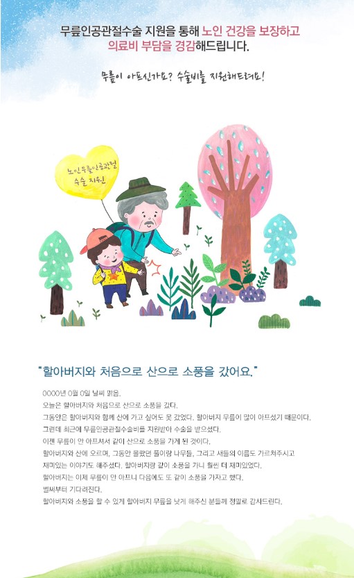 이 사업은 무릎 통증 등으로 일상생활에 제약을 받는 노인들에게 수술비를 지원해, 의료비 부담을 경감하고 건강한 노후를 보장하기 위한 취지로 운영된다.